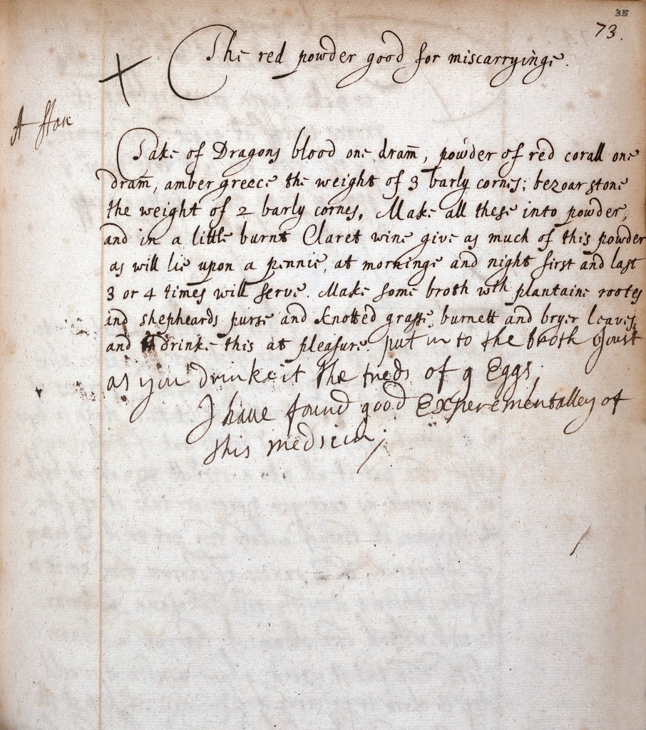 As a researcher, I’m interested in recovering vernacular and informal health-related practices, particularly those occurring in sites such as households. In recent years, handwritten recipe books with instructions to make a range of food and medicines have emerged as key sources for this research. Hundreds of books of recipes are available for study in libraries and archives and make for fascinating reads. As each book can contain up to two hundred or more recipes, when taken together, these notebooks make for a huge archive. Take for example this recipe to prevent a miscarriage in the book of Lady Ann Fanshaw.